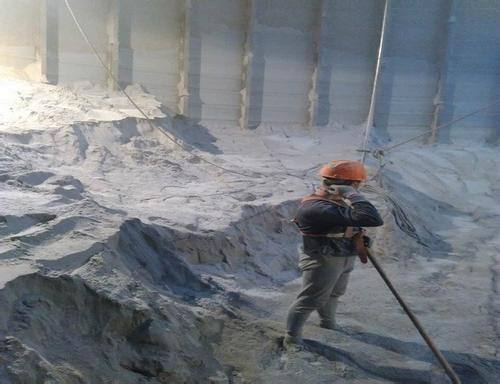 清理時(shí),遇上較松的粉料可用長棍捅下,如果結(jié)壁又厚又硬,則用風(fēng)鎬振松后使其垮下。當(dāng)作業(yè)位置離人孔門位置變遠(yuǎn)后可再派人進(jìn)入庫底配合作業(yè)或輪換,直到水泥結(jié)壁離錐面高度不超過2m時(shí),取消吊籃作業(yè)。水泥灰?guī)臁⑺噤摪鍌}、水泥罐的庫側(cè)都設(shè)有人孔,此時(shí)作業(yè)人員可從庫側(cè)的人孔進(jìn)入,站在側(cè)面撬棍或靠在庫壁的竹梯上用風(fēng)鎬振松結(jié)壁。